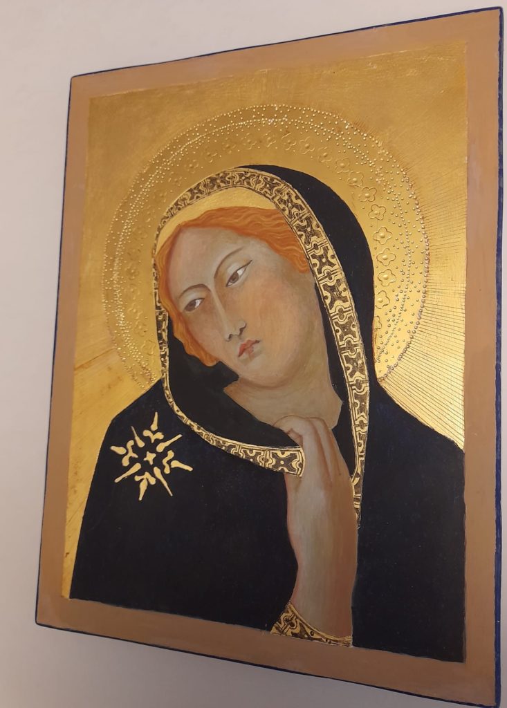 Ikona na desce o wymiarach 40 × 30 cm, wykonana tradycyjną techniką tempery jajowej i zdobiona złoceniem.